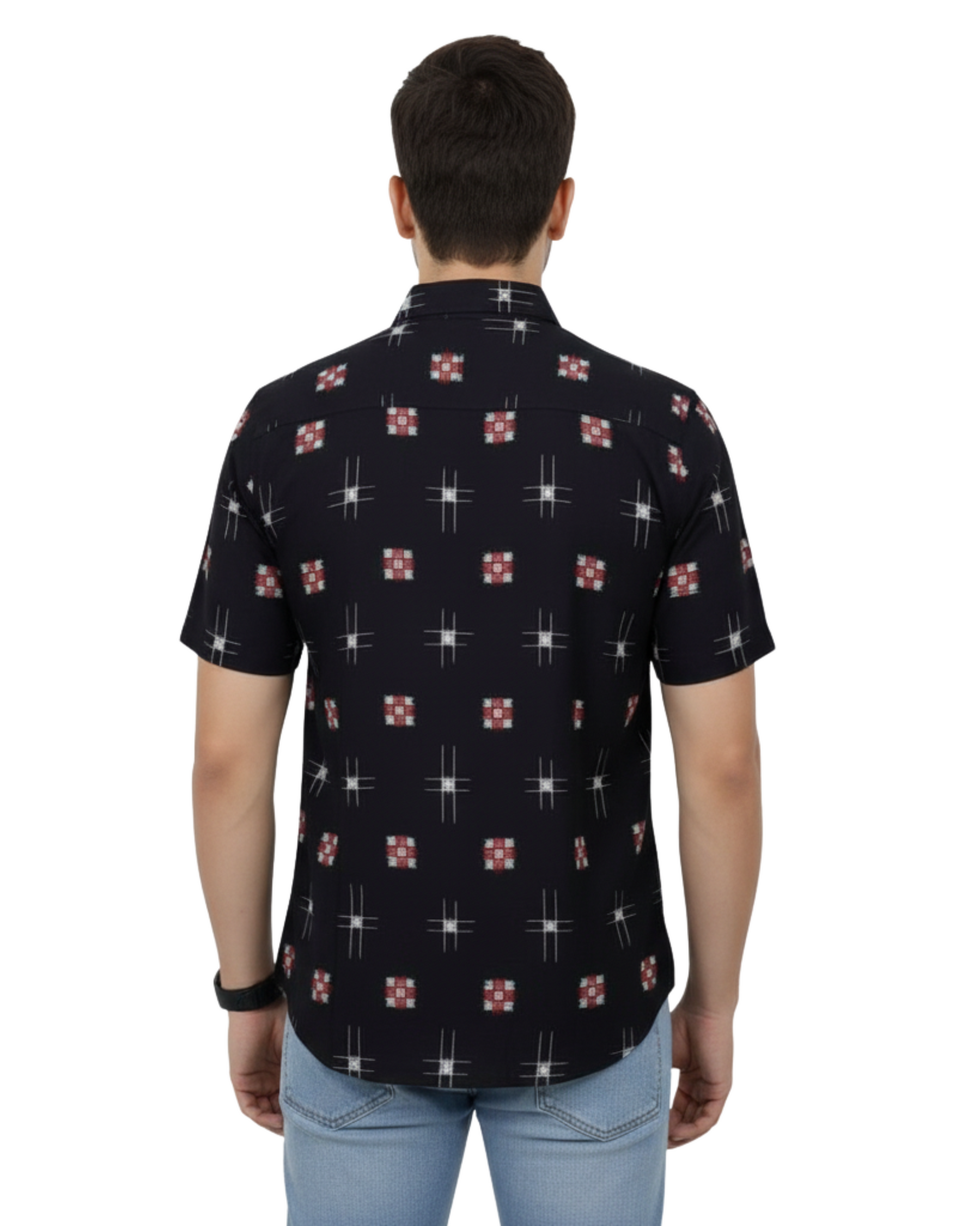 Step into timeless style with our Sambalpuri Crown Black Ikat Shirt, handwoven by skilled artisans of Odisha. The bold black base with striking red-white ikat motifs brings out the charm of authentic Sambalpuri weaving. Lightweight, breathable, and soft on the skin, this shirt is perfect for everyday comfort while making a statement at cultural events, office gatherings, or festive celebrations.